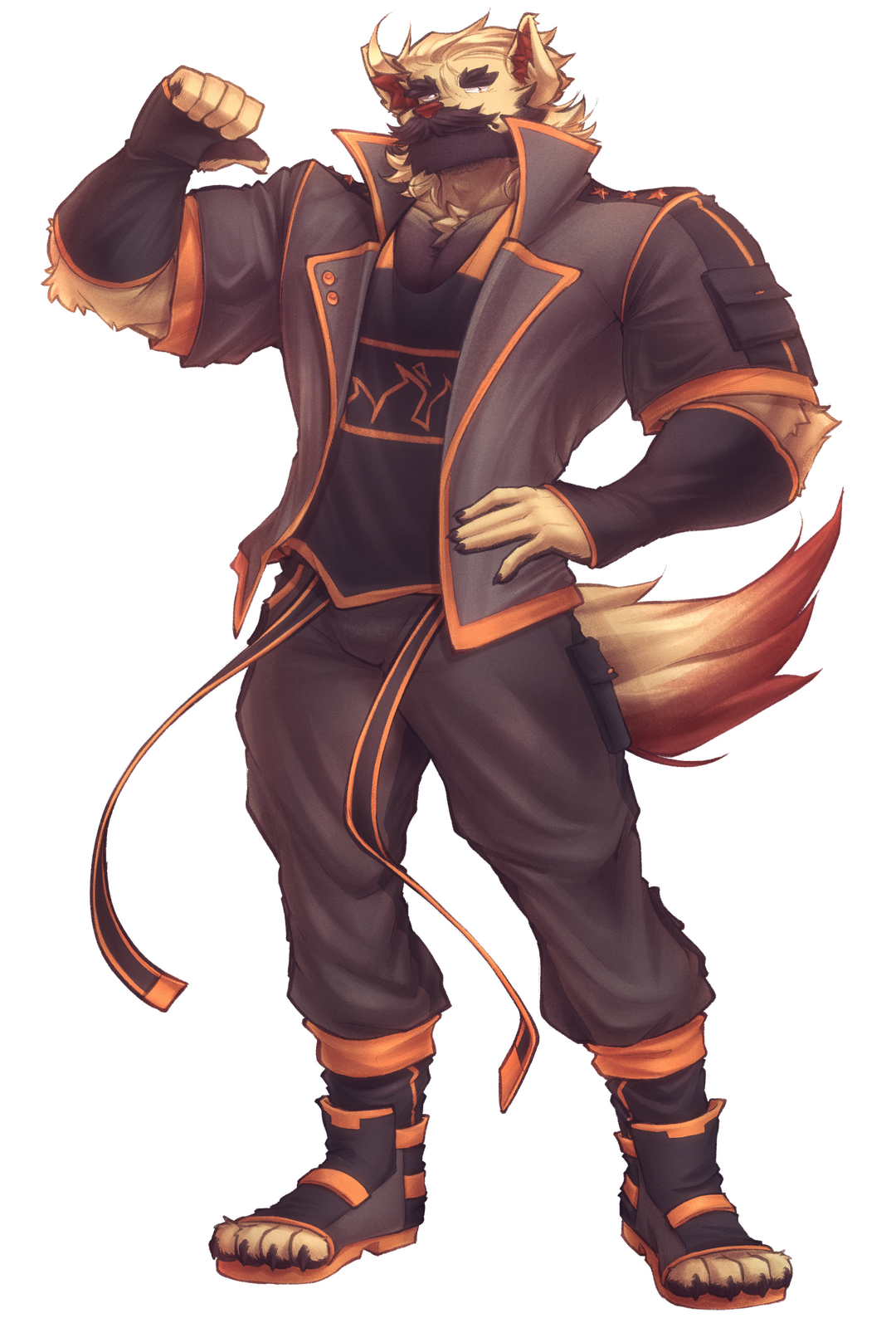 Kiiro Shiroinu is a 27-year-old golden retriever/husky mix. His birthday is on November 30th 1998, making him a Sagittarius.Kiiro is often seen as a cold, harsh man, often painfully direct with his speech. His resting expression doesn't help, either, as it's both intimidating and grumpy. Yet, inside that rigid exterior is a very caring, considerate, almost puppy-like side that he prefers to keep hidden from people he isn't acquainted with. He's very protective of his close friends and will go to any end for them, no matter what would be required of him.He also has a power that allows him to control fire, called Pyrokinesis, which was indirectly passed down from his family. His power was a genetic mutation from his father, Keiji's Cryokinesis, which allowed him to control ice. This had been a big source of strife for Kiiro in his early years, but he's since learned to own his powers rather than be afraid of them. His powers have downsides, however, as he tends to overheat a lot as his body temperature is much higher than what would be considered normal. He's not able to get physically burnt, though, technically allowing him to drink pure lava if he ever wanted to(?).Singing is considered a stress reliever to Kiiro, alongside fitness; he doesn't see it as anything other than a hobby. He's content with this, though, as he works part-time at the local gym, which pays more than enough for his needs. His mother, Sachiko, used to be a locally-famous singer in her prime years and took Kiiro under her wing when he told her about his developing hobby.APPEARANCE: